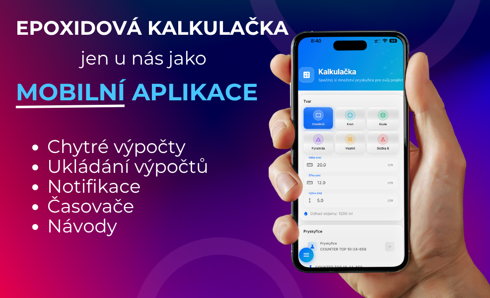 Nejste si jistí? Pomůže vám Kalkulačka spotřeby pryskyřice (objem, vrstvy, odhad) nebo mobilní aplikace „Epoxidová kalkulačka“ s časovači a návody.