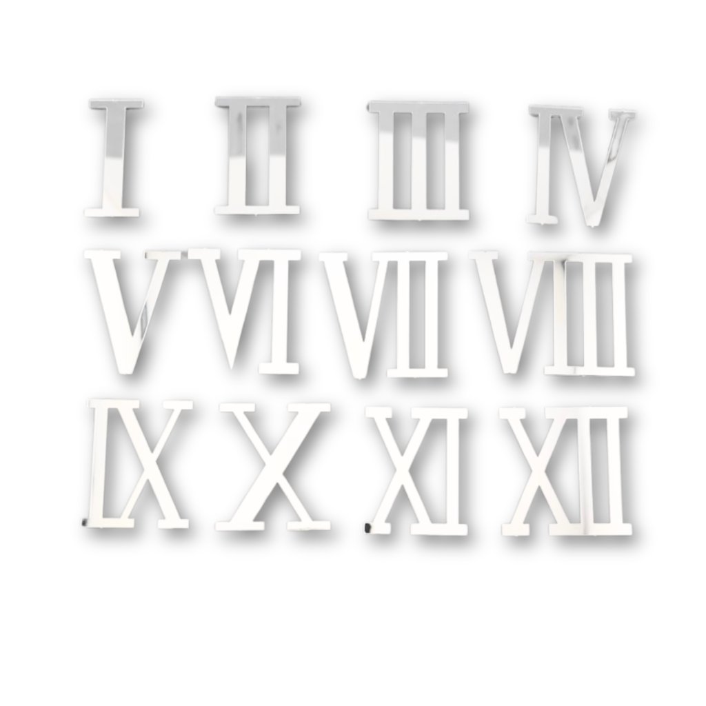 Die silbernen Spiegel-Römischen Ziffern passen perfekt zu den Uhrenwerken und Zeigern aus unserem Sortiment und sind ideal für die kreative Herstellung von originellen Uhren aus Kunstharz und Naturmaterialien.