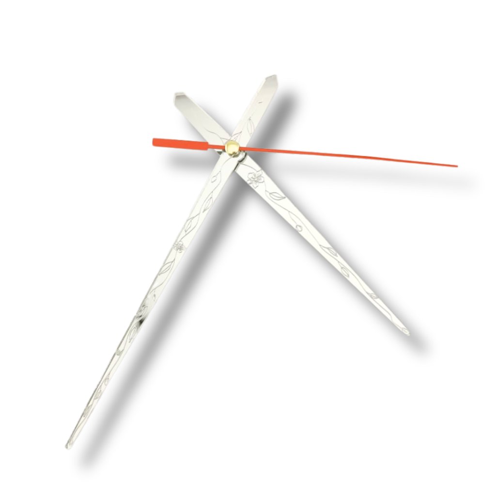 Sada hodinových ručiček zrcadlové stříbrné 100/140 mm – Květa je určená pro všechny, kteří chtějí svým hodinám dodat nejen funkčnost, ale i jemný dekor. Hodinová i minutová ručička mají gravírovanou květinovou rytinu s linkami, která z nich dělá elegantní a romanticky laděný prvek. Kontrastní červená vteřinová ručička pak zvýrazní pohyb času a ciferník opticky rozzáří.