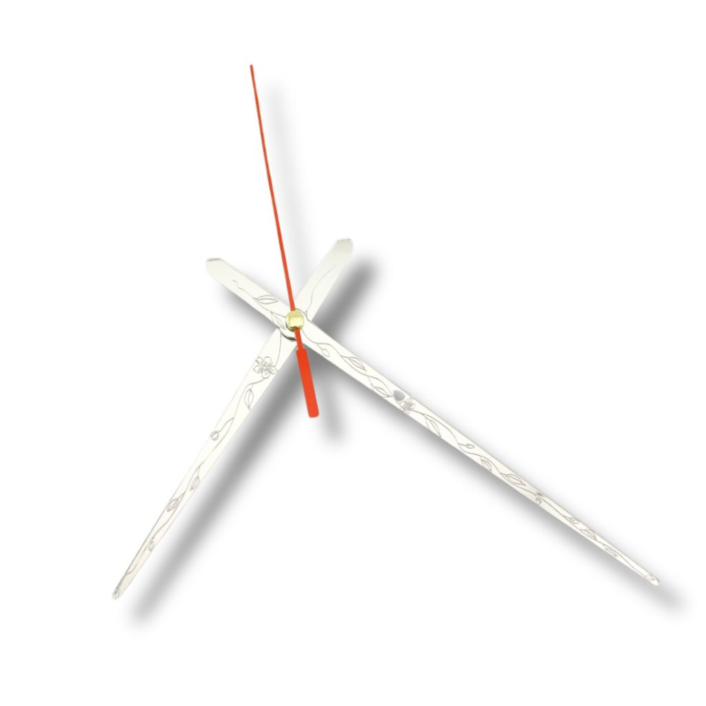 Sada hodinových ručiček zrcadlové stříbrné 110/160 mm – Květa je ideální pro všechny, kdo chtějí, aby ručičky na hodinách byly nejen funkční, ale i krásným dekorem. Obě stříbrné ručičky mají gravírovanou rytinu s linkami a květy, která dodává ciferníku jemně romantický a elegantní charakter. Celek doplňuje tenká červená vteřinová ručička, která zvýrazní pohyb času.