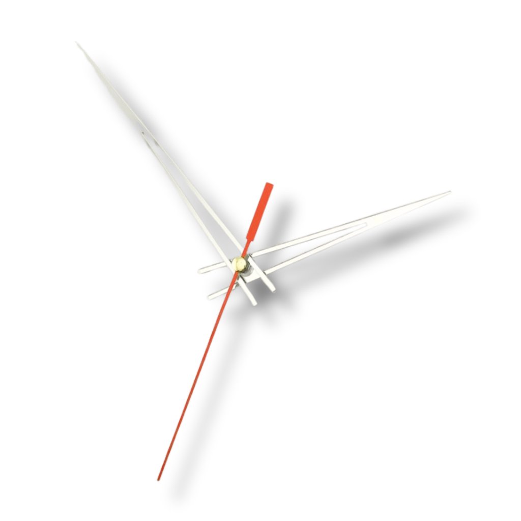 Obě stříbrné ručičky mají moderní úzký „V“ profil s jemným výřezem, který hodinám dodává velmi přesný a čistý vizuální dojem. Tenká červená vteřinová ručička vytváří výrazný barevný akcent, pomáhá okamžitému vnímání času a celé hodiny opticky oživí.