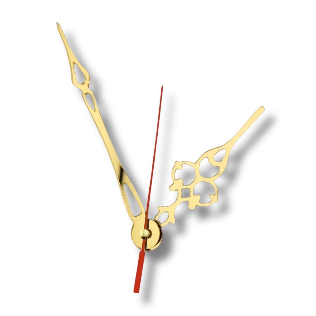 Sada hodinových ručiček zrcadlové zlaté 110/160 mm – Renata je ideální pro všechny, kdo chtějí svým hodinám dodat elegantní, lehce vintage a zároveň moderní vzhled. Hodinová ručička má dekorativní ornament s jemnými křivkami, minutová ručička je štíhlá s podlouhlými výřezy a zúženou špičkou. Celek doplňuje tenká červená vteřinová ručička, která přidá ciferníku dynamiku a lepší čitelnost času.