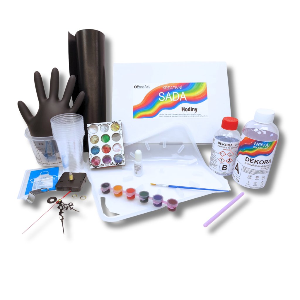 Kreativní sada – Hodiny spojuje licí pryskyřici, barvy, glitry, silikonovou formu, hodinový strojek i praktické pomůcky do jednoho uceleného balení. Umožní vám vytvořit osobité nástěnné hodiny, které budou zároveň výraznou dekorací i originálním autorským kusem ve vašem interiéru.