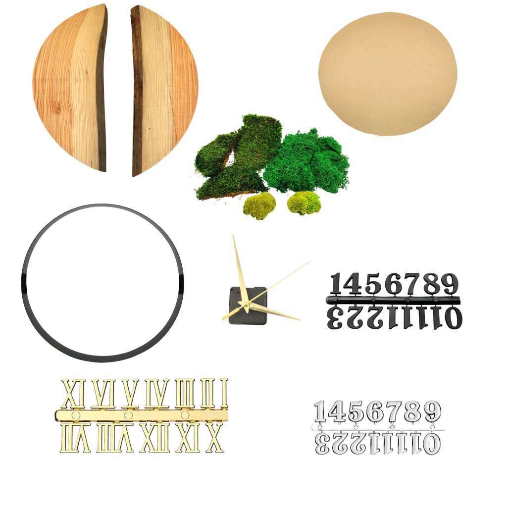 S touto sadou si vytvoříte designové mechové hodiny, které se hodí do moderních i přírodně laděných interiérů. Okrajové výseče umožňují zajímavou kompozici – mechová plocha může být soustředěná jen v části ciferníku, zatímco zbytek tvoří čisté dřevo a kovový rám.