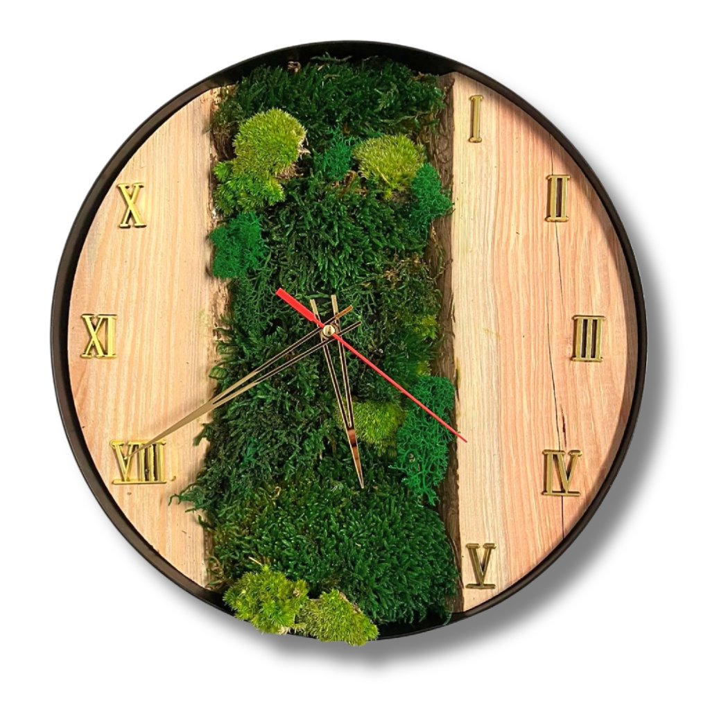 - Přírodní vzhled – stabilizované mechy dodají hodinám svěží zelený „živý“ efekt bez nutnosti údržby.