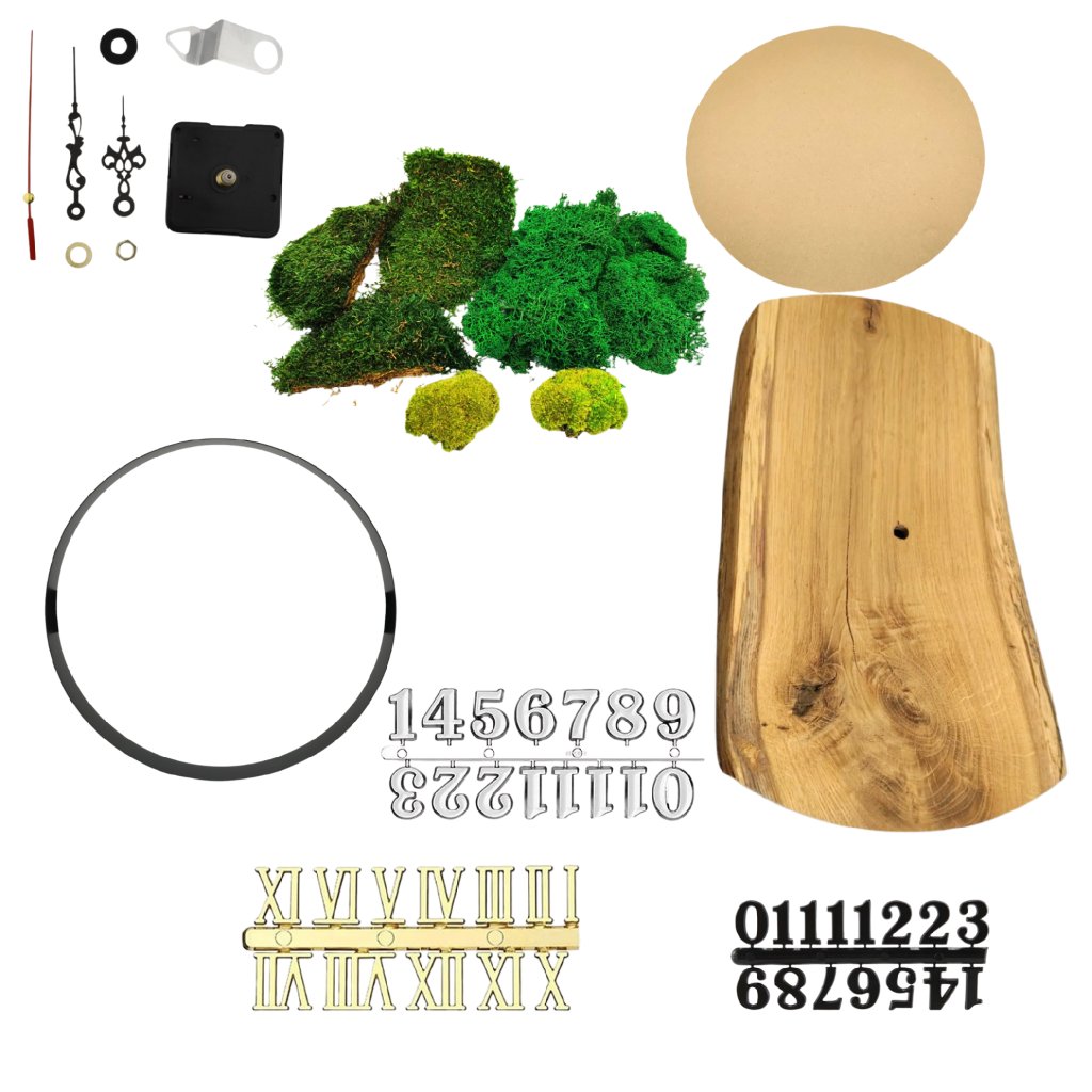 Kreativní sada – mechové hodiny se středovým výsekem je navržená tak, abyste z ní snadno vytvořili moderní nástěnné hodiny s přírodním vzhledem. Kombinuje kovovou obruč, dřevěnou středovou výseč s prostorem pro hodinový strojek, mix stabilizovaných mechů a kvalitní hodinový strojek s rustikálními černými ručičkami. Navíc získáte hned tři různé sady číslic, takže si vzhled ciferníku upravíte přesně podle svého stylu.