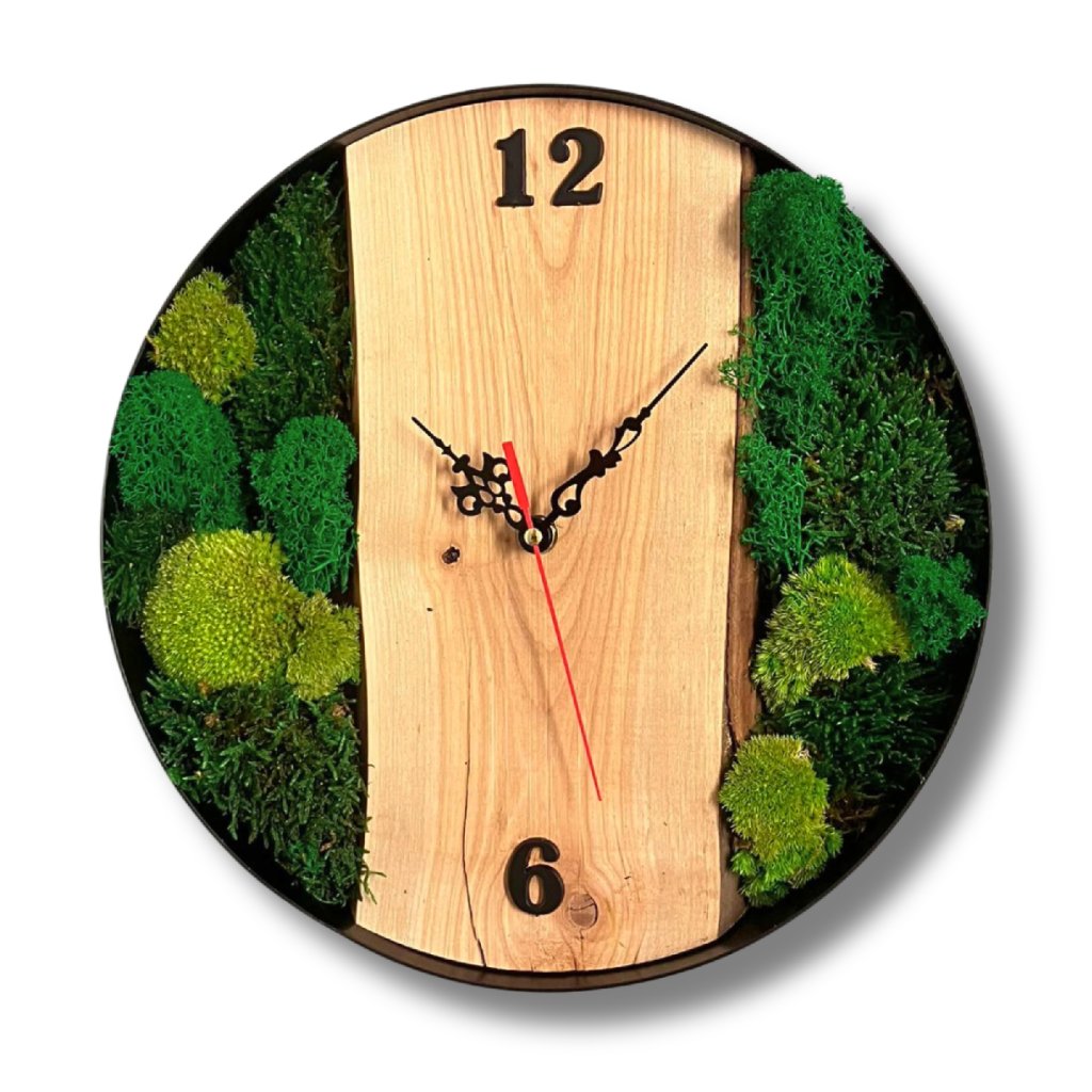 Výsledkem jsou mechové hodiny o průměru cca 30 cm se dřevěným středem a zeleným okrajem z mechu. Mechová plocha může tvořit prstenec kolem středu, zatímco dřevěná výseč zůstane čistá pro ciferník, ručičky a číslice. Kovová obruč vše elegantně orámuje.