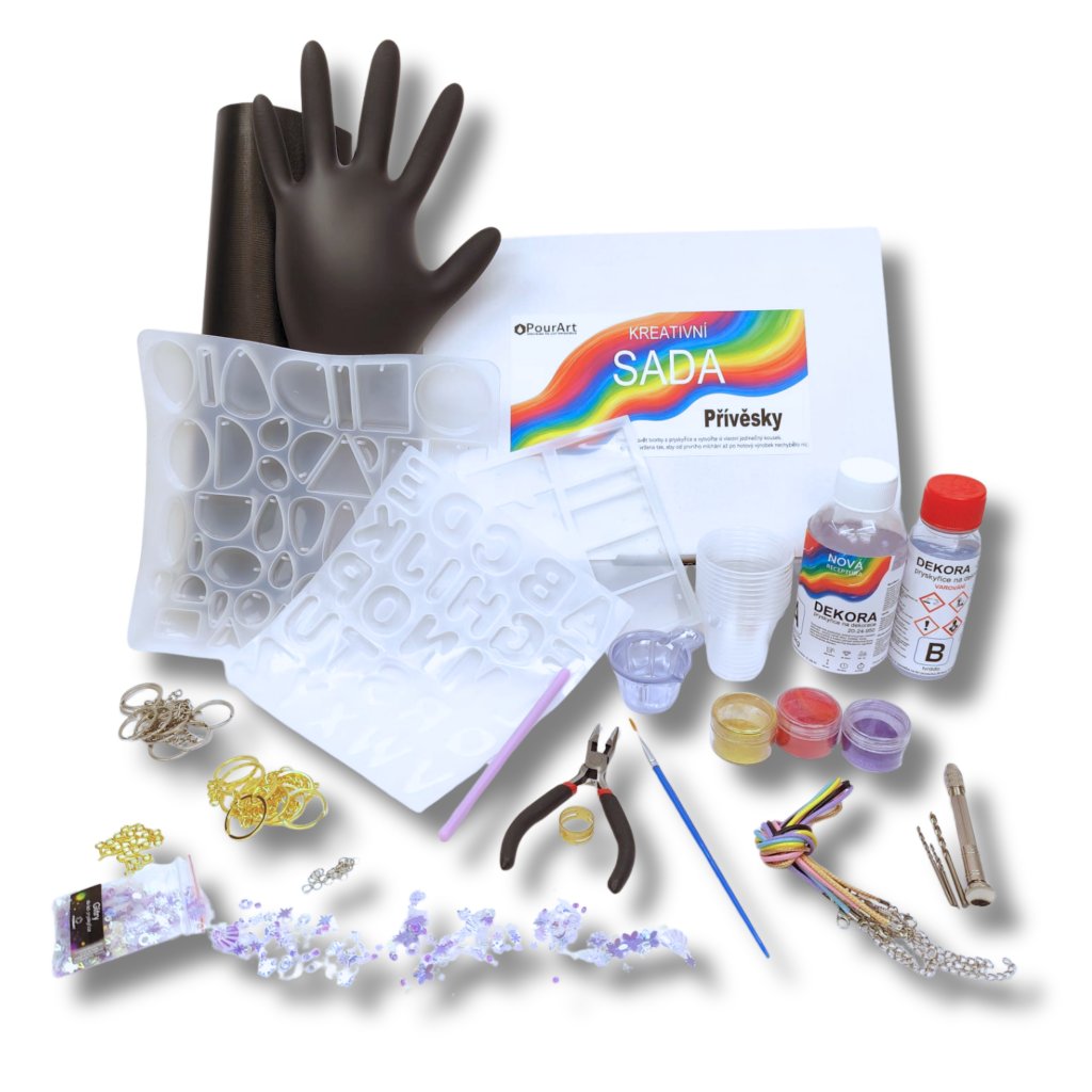 Kreativní sada – Přívěsky spojuje licí pryskyřici, barevné pigmenty, glitry, šperkové komponenty, silikonové formy a pomůcky do jednoho uceleného balíčku. Umožní vytvořit širokou škálu originálních přívěsků, klíčenek a šperků, které budou odrážet osobní styl a fantazii tvůrce.