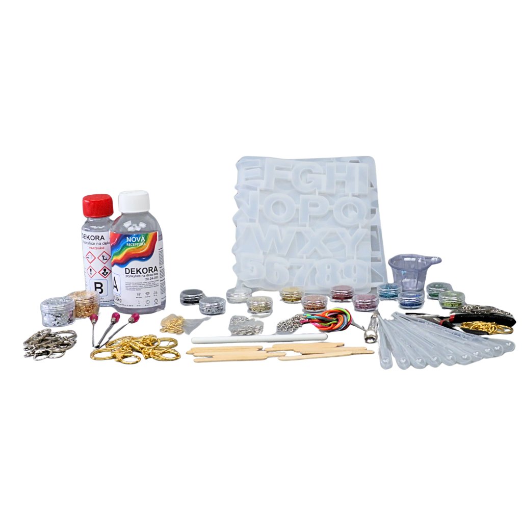 Tato kreativní sada je určena pro každého, kdo si chce pro sebe nebo jako dárek vyrobit originální přívěsek ve tvaru písmena či čísla. V jedné silikonové formě jsou písmena abecedy i čísla. Sada obsahuje oblíbené kovové fólie a dvanáct malých dóz s různými glitry. Součástí jsou také bavlněné voskované řetízky na krk, ruční vrtačka s vrtáčky, kleště a kompletní sada vrutů s očkem, karabinek, kroužků a klíčenek ve zlaté i stříbrné barvě. Balení navíc obsahuje 0,7 kg pryskyřice vhodné pro malé dekorace a šperky.