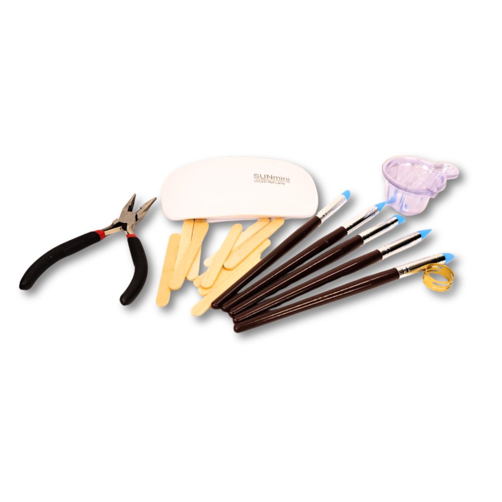 Sada pomůcek pro tvoření s UV pryskyřicí vám ušetří čas s výběrem jednotlivých nástrojů a umožní soustředit se na to nejdůležitější – na samotné tvoření, experimentování s barvami a radost z hotových šperků.