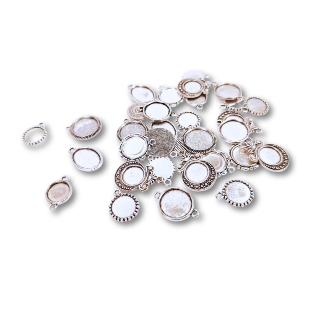 Lůžko na pryskyřici – stříbrné, mix 6 ks je praktická sada šperkových komponent pro všechny, kteří milují tvorbu z pryskyřice. V balení najdete 6 kusů stříbrných lůžek v různých tvarech a velikostech – ideální pro kombinaci přívěsků na krk i visacích náušnic.