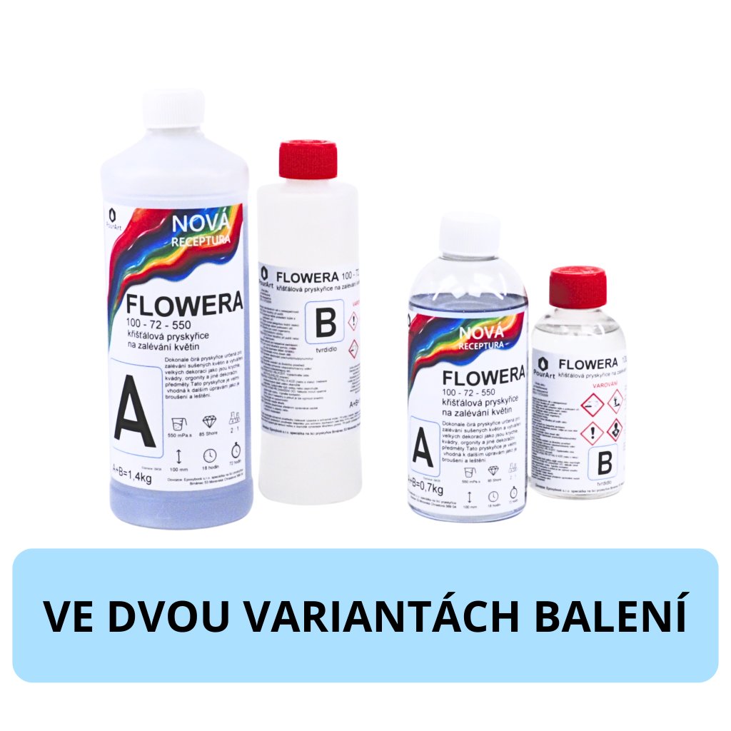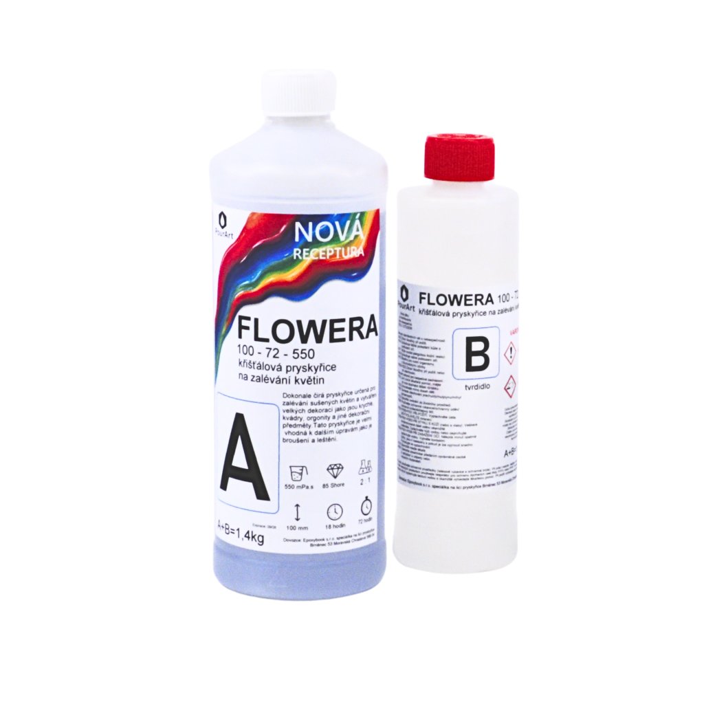 FLOWERA 100-72-550 UV++ je řídká křišťálově čirá epoxidová pryskyřice určená pro zalévání sušených květin, brouků a dalšího drobného botanického materiálu. Díky nízké viskozitě výborně prostupuje detaily a po vytvrzení vytváří hladký, vysoce lesklý povrch.
