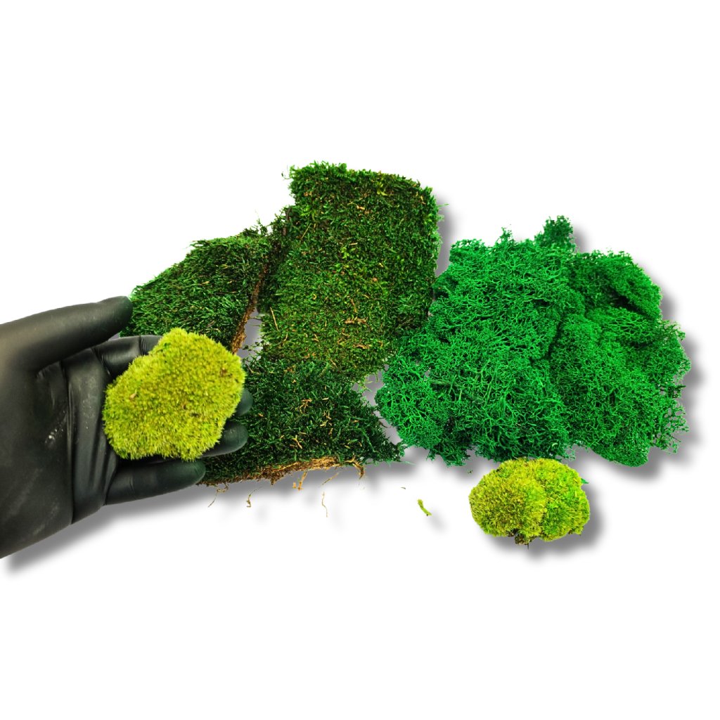 Bocháňkový tvoří plastické „kopečky“ pro 3D akcenty, lišejník má jemnou větvenou strukturu se sytou barvou a plochý mech slouží jako rovnoměrný podklad.