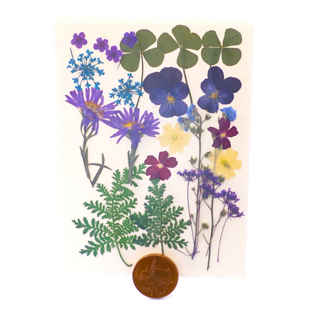 Profesionálně sušené květiny na papírovém archu jsou uzavřené v neprodyšné fólii pro zachování barvy a kvality rostlin. Sušené květiny využíváme při výrobě šperků a různých dekorací z pryskyřice.